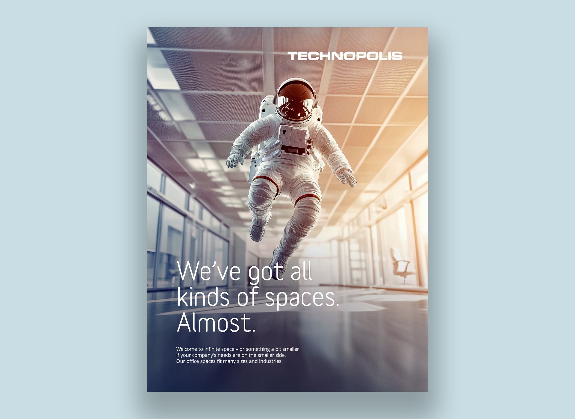 Vaikka Technopoliksen tarjoama on hyvin samanlainen kuin monilla muilla toimijoilla, sillä on myös selkeitä kilpailuetuja: erinomainen palveluasenne, näyttöjä aidosti monipuolisten toimitilojen tarjoajana ja vahva asiakaskokemus. Asiakastutkimuksista esiin noussut “Technopolis-henki” – avulias, inspiroiva ja lämmin kumppanuus – kiteytti nämä asiat ja tarjosi vahvan pohjan brändin erottumiselle. Tekoälyn suosiollisella avustuksella lähetimme astronautin tutustumaan tiloihin: We’ve got all kinds of spaces. Almost.